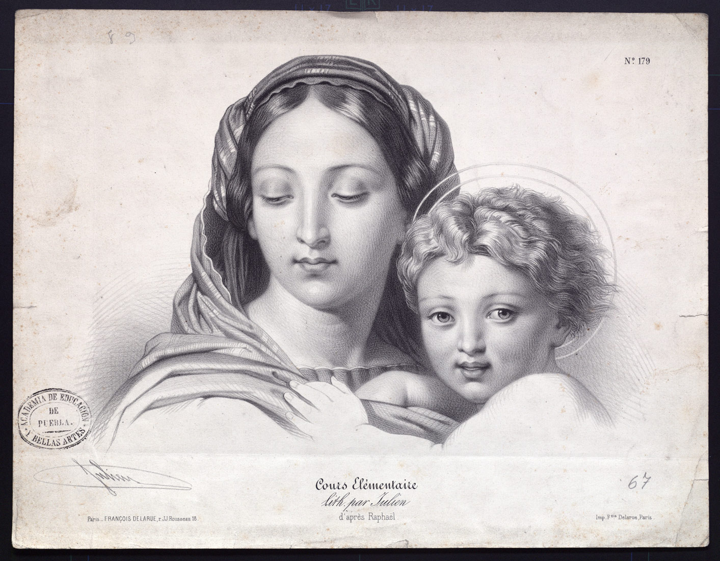 - Esquina superior derecha: N° 179. Esquina inferior izquierda: Paris. FRANCOIS DE LA RUE, r. J J. Rousseau, 18. Centro inferior: Cours Elémentaire. / Lith par Julien / d'après Raphaël'. Esquina inferior derecha: Imp. Fois Delarue, Paris.